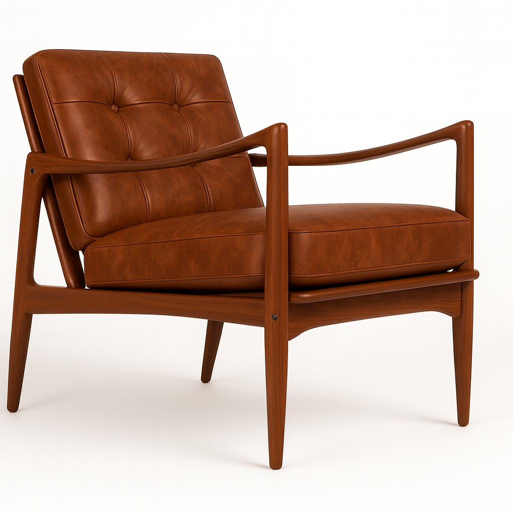 Hans lenestol henter inspirasjon fra 60-tallets rene linjer og tidløse formspråk. Med sin karakteristiske ramme i massivt tre og polstring i skinn, kombinerer stolen et retro uttrykk med ekte komfort.